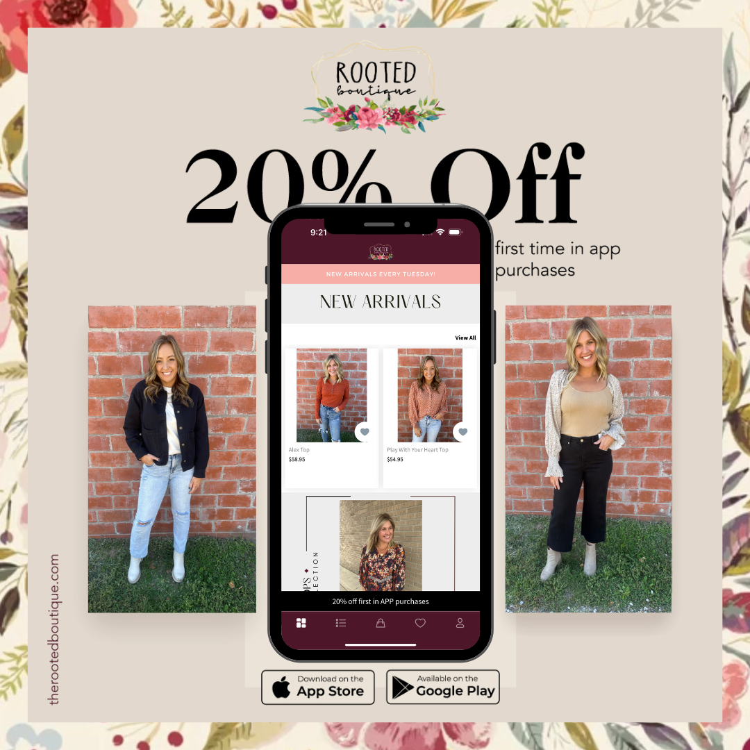 Find what you love, plant those roots deep and let us help you look great along the way. Download our mobile app on your smart phone for first dibs on all things Rooted! Plus, save 20% on your first in-app purchase with code: getrooted